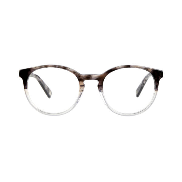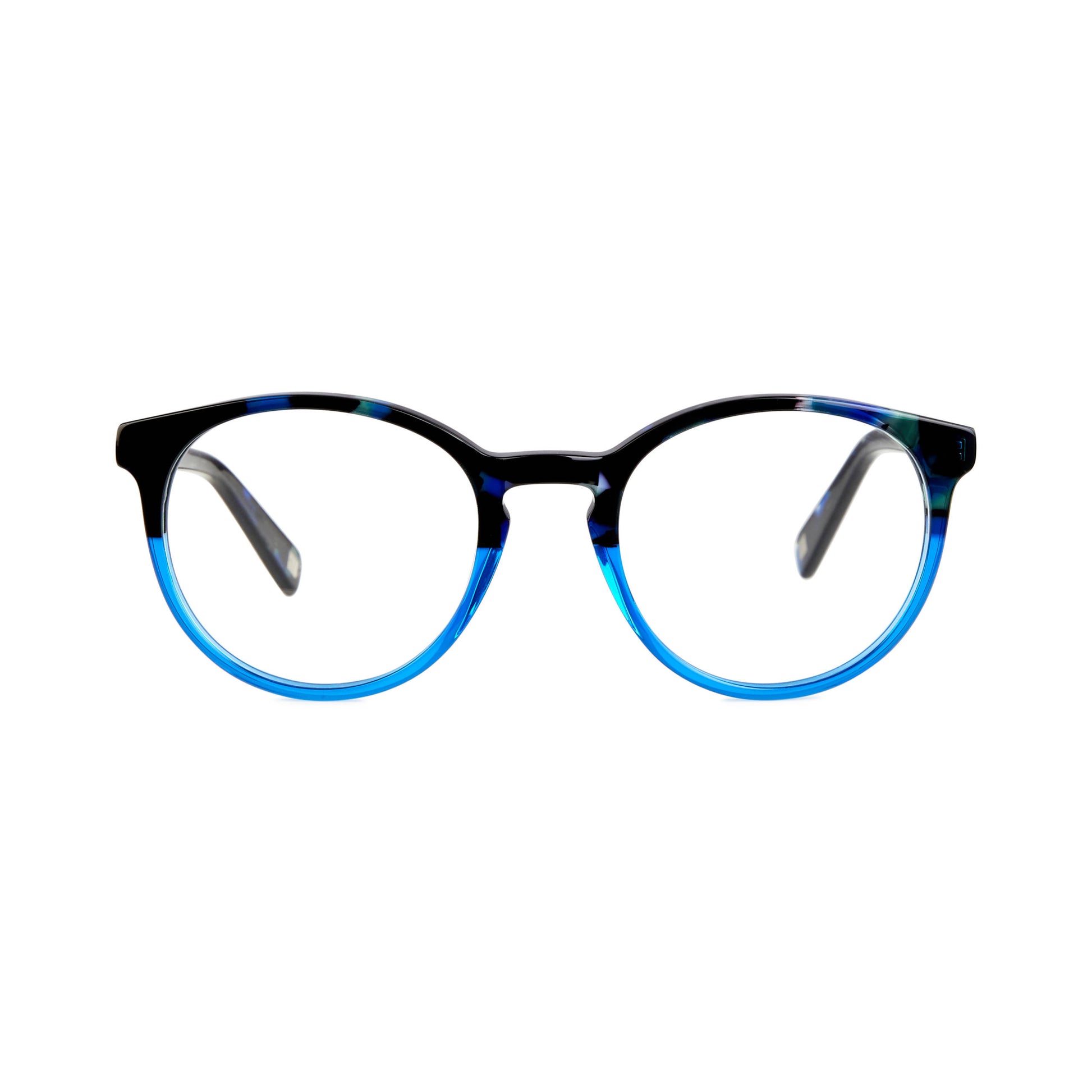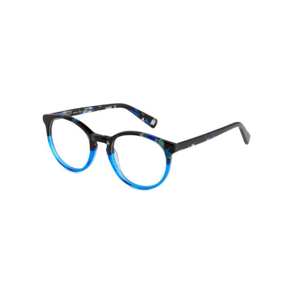 The retro-inspired round frame is available in a classic brown tortoiseshell, a neutral-clear combo and in a cosmic two-tone blue. Created from high-quality acetate making the frames strong, lightweight and durable.